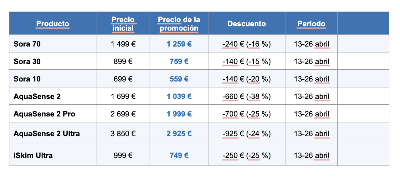 Justo a tiempo para la inauguración de las piscinas el 25 de abril, Beatbot ofrece descuentos exclusivos en toda su gama de productos. Válidas hasta el 26 de abril, las mejores ofertas incluyen: