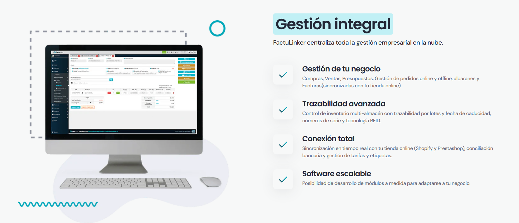 FactuLinker es un innovador software de gestión en la nube diseñado específicamente para eCommerce, que centraliza toda la operativa del negocio: compras, ventas, almacén, inventario y facturación. Además, incorpora un sistema POS y un kiosko de autoventa, ofreciendo una gestión integral desde una única plataforma, con sincronización nativa con Shopify y PrestaShop.
