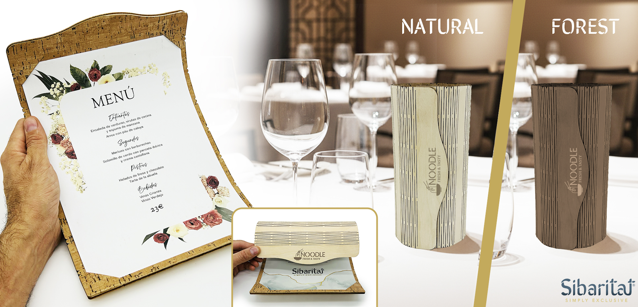 El resultado es un portamenús enrollable, único en el mercado y con patente en curso, fabricado en madera natural, con cierre magnético y grabado láser personalizado con el logotipo del restaurante. Cada pieza se elabora artesanalmente y se adapta a la identidad visual de cada establecimiento, con diferentes acabados y maderas nobles.